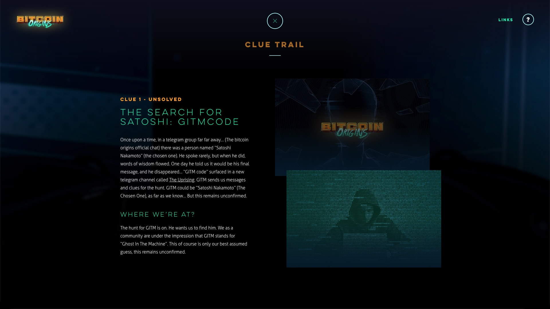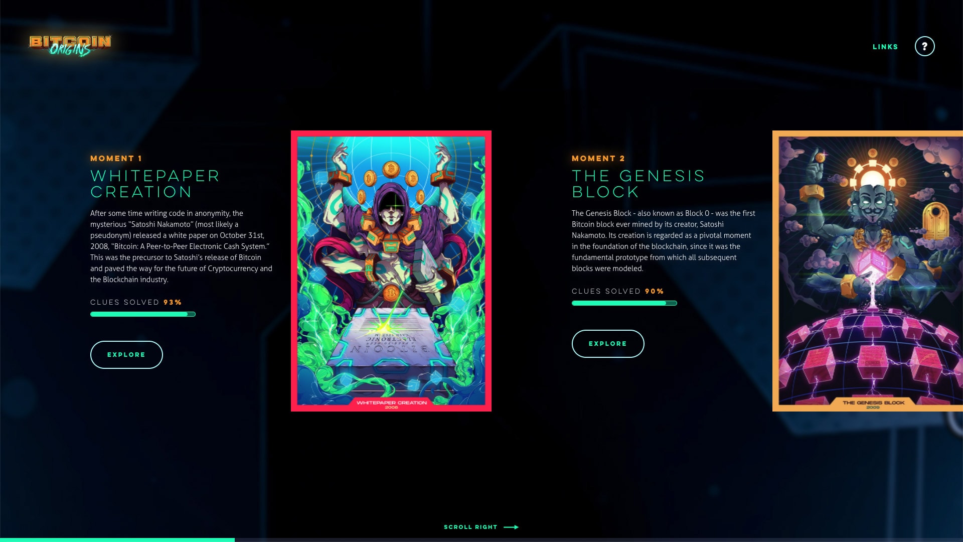 Each clue helps the community unlock the next clue in the hunt and eventually to unlock the next ‘Moment’ in Bitcoins history.
