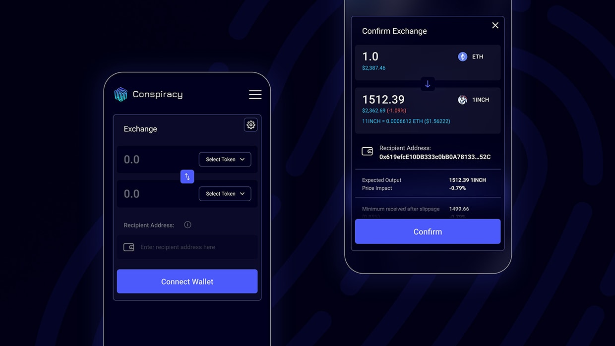 After working across UX and UI to fully design their dapp, we handed over to the Conspiracy team to develop one of the first decentralised exchanges to incorporate PriFi (private decentralised finance). The designs have been well received by the Conspiracy community and, coupled with the brand we crafted, have given them a strong presence in the space ahead of their product launch.