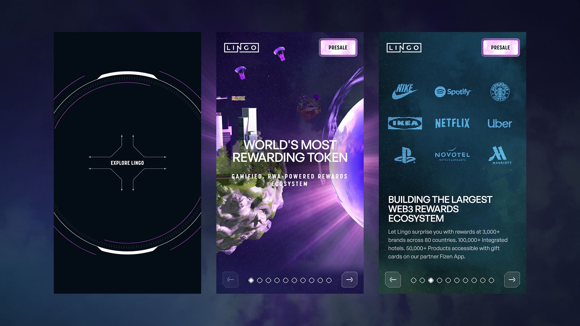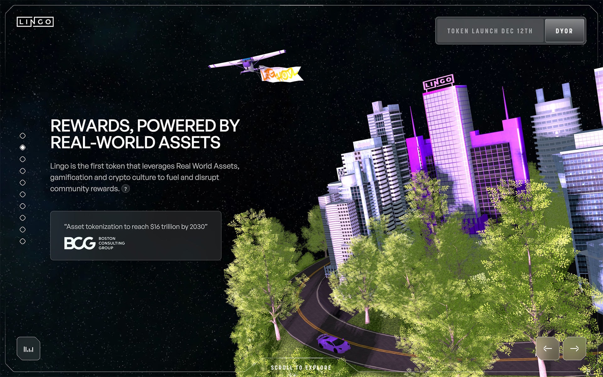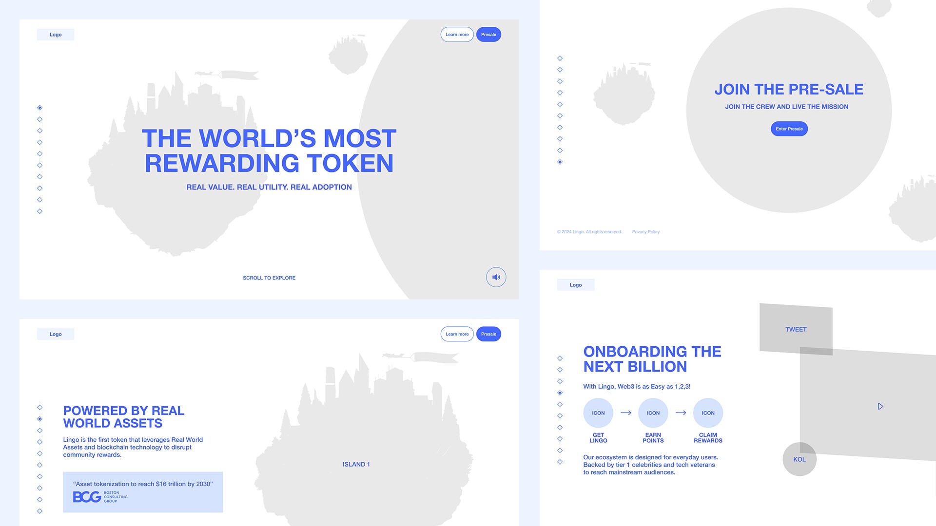 Lingo was enthusiastic about incorporating 3D elements to convey its visionary ambitions. Our concepts involved crafting ‘Lingo island’ models, featuring vibrant city skylines and playful animated details like Lamborghinis and literal ‘airdrops’ revolving around the Lingo sun which represents the Lingo ecosystem.