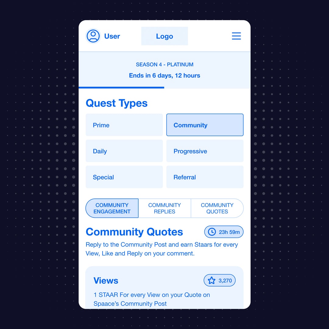 Spaace Arena features six different categories of quests, each offering unique challenges. Examples include engaging with the teaser website or owning certain BlueChip NFT projects. By diversifying the quest types, we eliminate the risk of users feeling like anything is too repetitive.